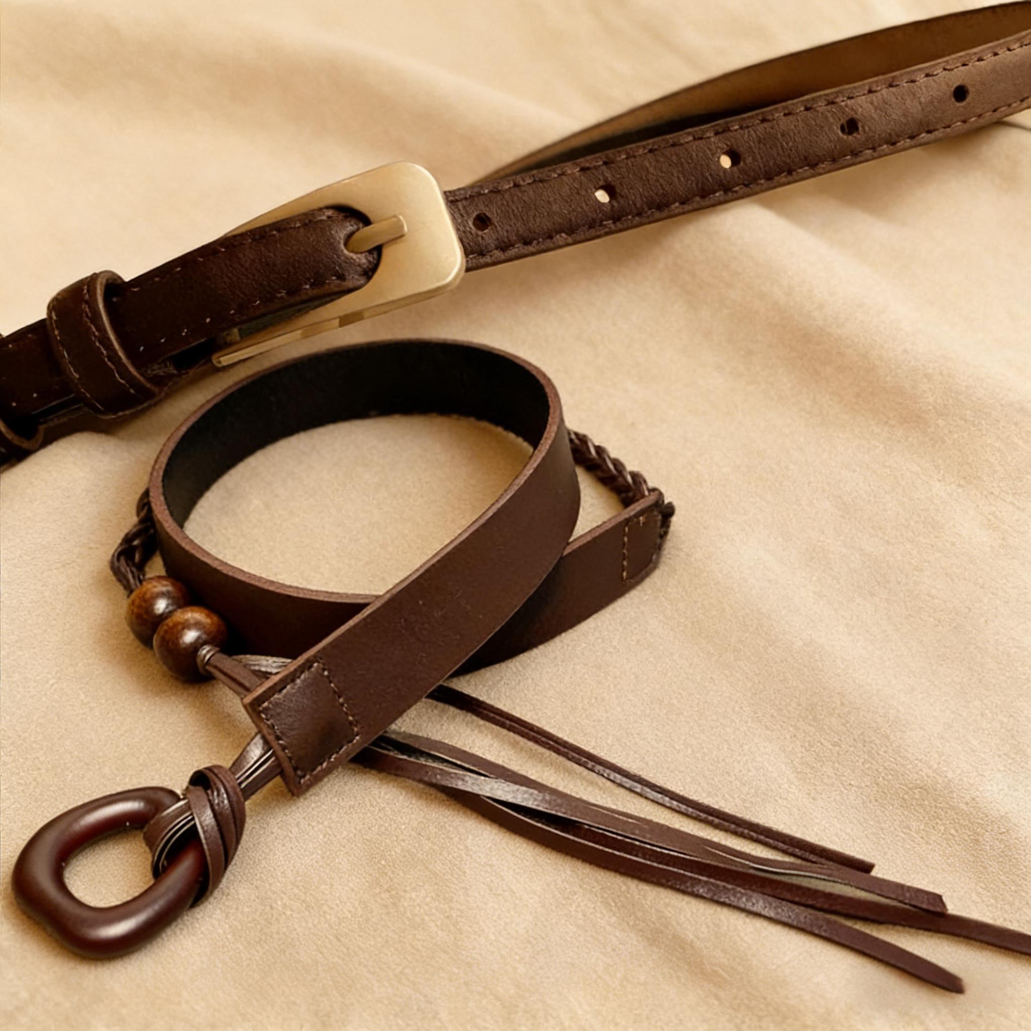 Hand-knotted tie belt with decorative beads and tassels, made from durable PU material. The adjustable slim design works easily with dresses, skirts, or casual outfits and is available in black or coffee.